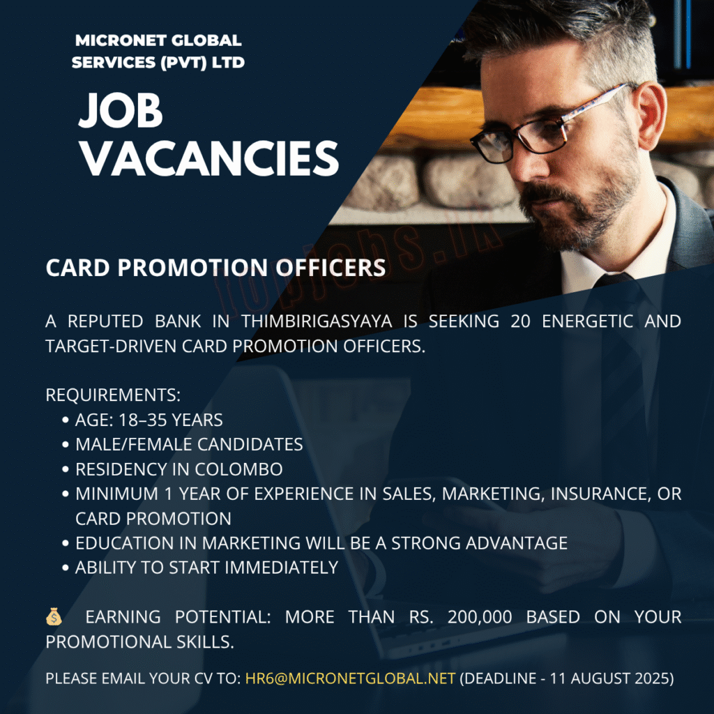 Banking, Investments & Finance / Recent Posts CARDS PROMOTION OFFICER – THIMBIRIGASYAYA (20 VACANCIES) CARDS PROMOTION OFFICER – THIMBIRIGASYAYA (20 VACANCIES) Read More