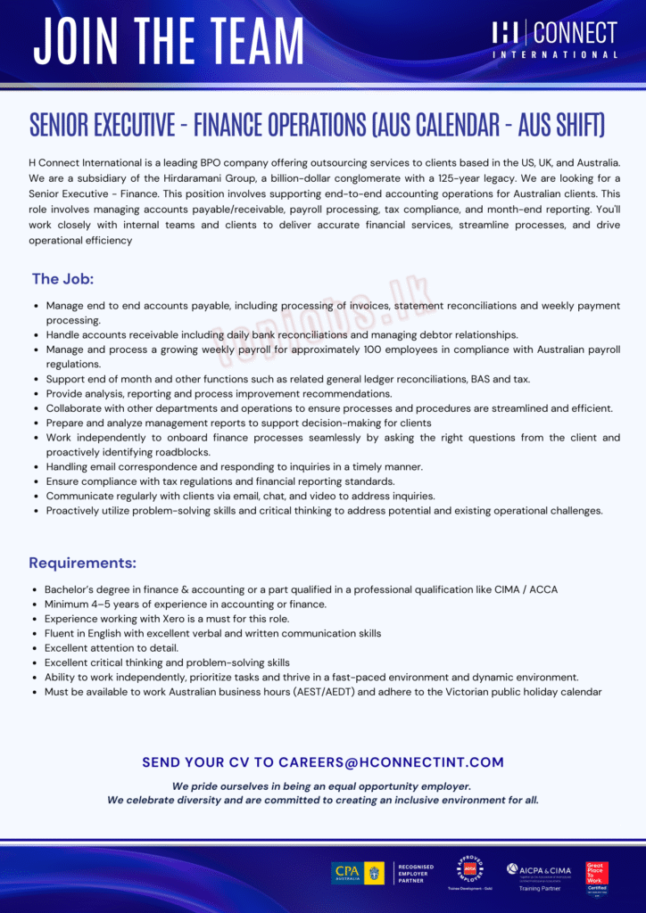 Senior Executive – Finance Operations (AUS CALENDAR – AUS Shift)
